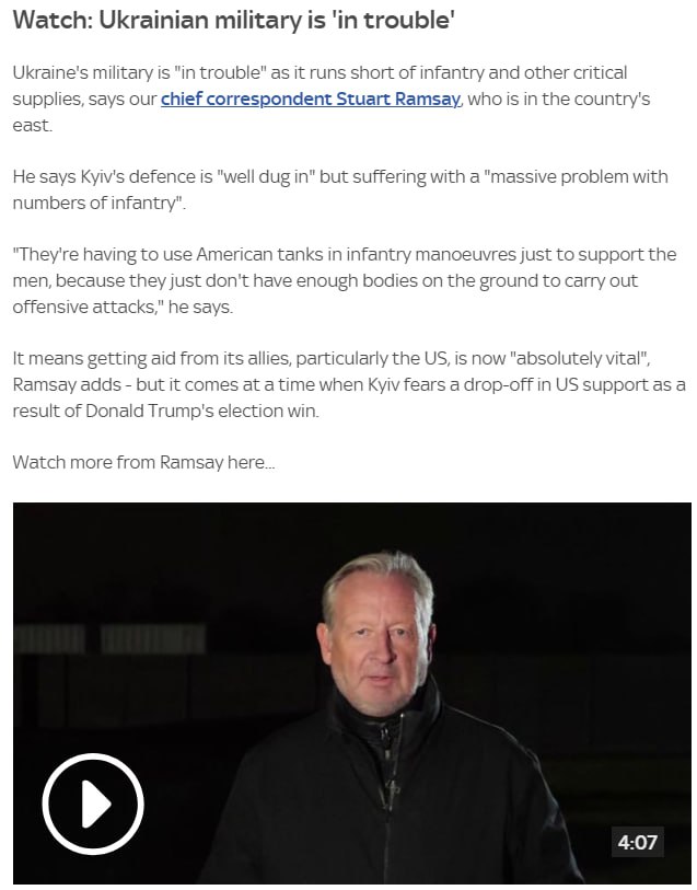 18.22 ВСУ находятся «в беде» из-за нехватки количества пехотинцев и других важных компонентов снабжения, заявляет корреспондент Sky News Стюарт Рамзи, находящийся на востоке Украины.