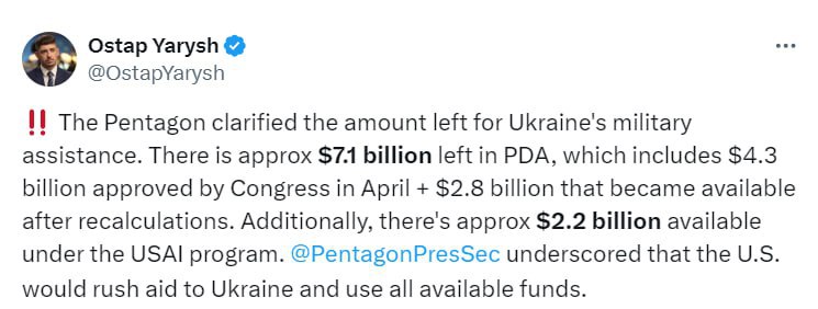 "Кроме того, около 2,2 млрд долларов доступны по программе USAI. Пресс-секретарь Пентагона Патрик Райдер подчеркнул, что США будут спешить с оказанием помощи Украине и используют все имеющиеся средства" , — написал Ярыш.