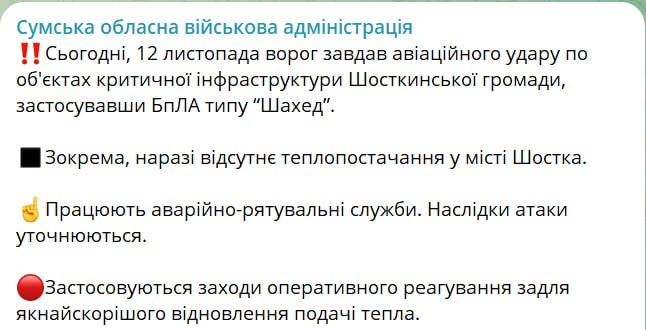 23.46 После удара «Шахедом» по объектам критической инфраструктуры Шостки Сумской области в городе пропало отопление.