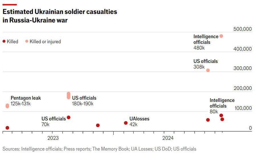 11.50 Не менее 60–100 тыс. украинских солдат погибли в ходе войны с РФ, еще около 400 тыс. были сильно ранены и больше не могут воевать, пишет The Economist.