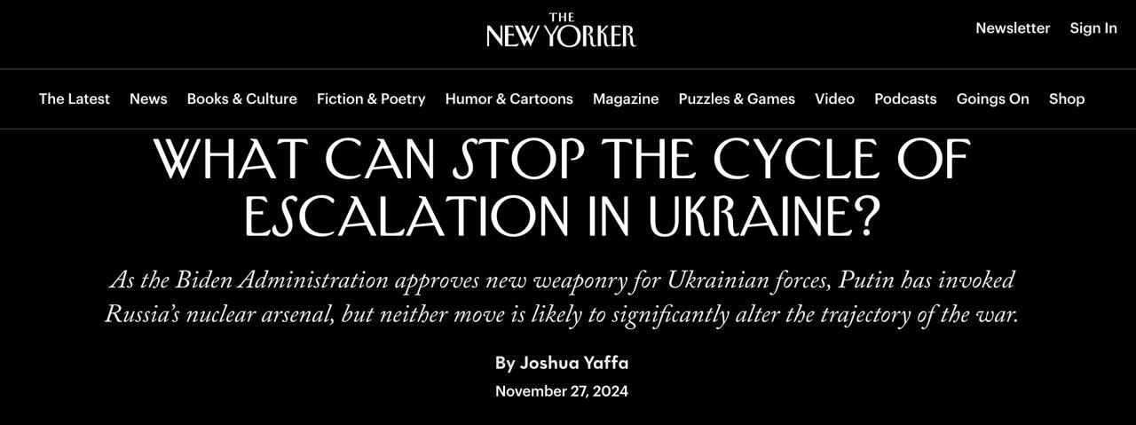Военный эксперт Кофман говорит: "похоже, что сейчас наступает время, когда администрация Байдена предпримет множество действий, которым она ранее сопротивлялась, чтобы попытаться избежать передачи войны на траекторию окончательного упадка". Кофман сравнил шквал нынешней активности Белого дома с "человеком, нажимающим все кнопки в лифте, а затем выходящим на своем этаже".