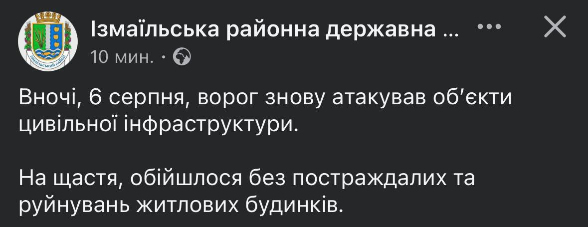 8.25 В ночь на 6 августа РФ атаковала объекты инфраструктуры в Измаильском районе.