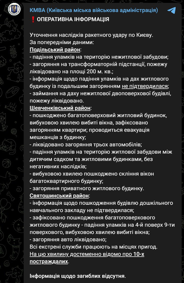 Последствия ракетного удара по Киеву от городской военной администрации по состоянию на 07.36.