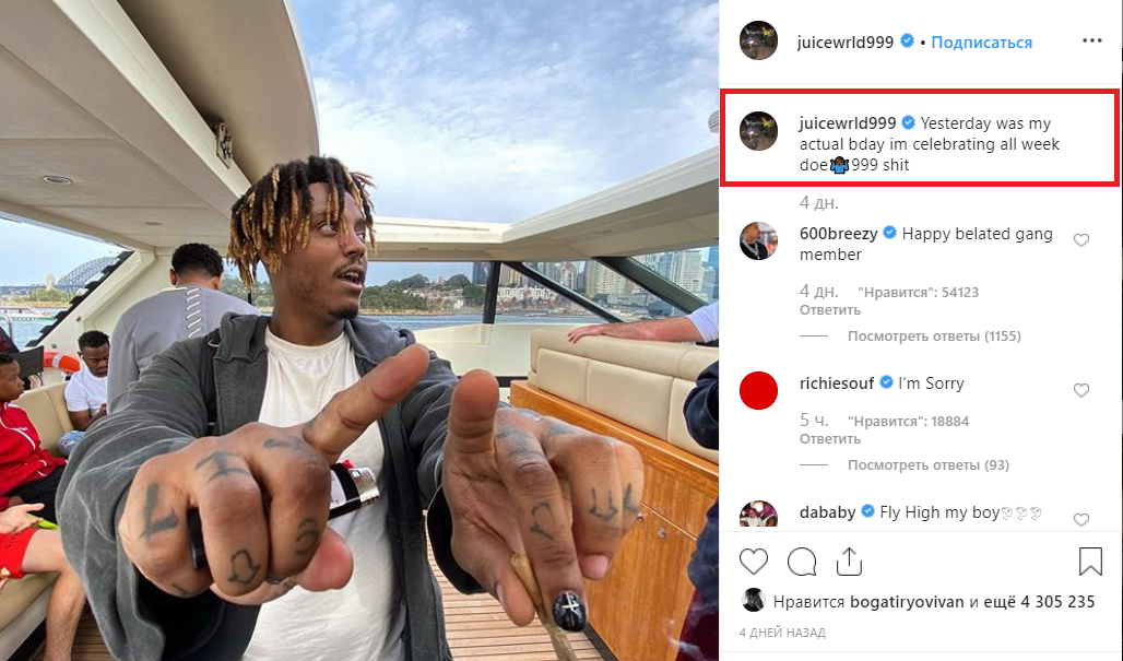 Ранее "Страна" сообщала, что в мае 2019 года Billboard назвал Juice WRLD лучшим молодым артистом мира.