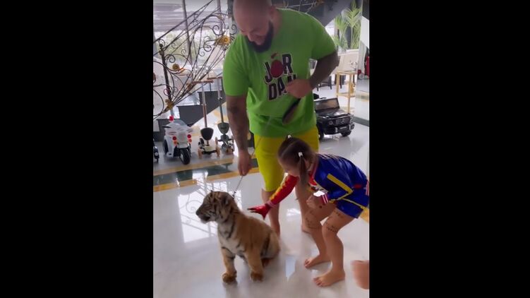 Дети музыканта очень обрадовались появлению в их доме дикого зверя и бросились его гладить и обнимать. Затем семейство отправилось во двор, где тигренок начал "охотиться" на наследниц Джигана. У него трое девочек и мальчик, которому чуть больше года.