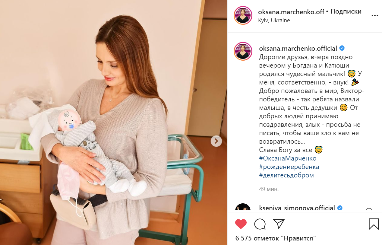 "У Богдана и Катюши родился чудесный мальчик! У меня, соответственно, - внук! Добро пожаловать в мир, Виктор-победитель - так ребята назвали малыша, в честь дедушки. От добрых людей принимаю поздравления, злых - просьба не писать, чтобы ваше зло к вам не возвратилось... Слава Богу за все", - написала Оксана Марченко.