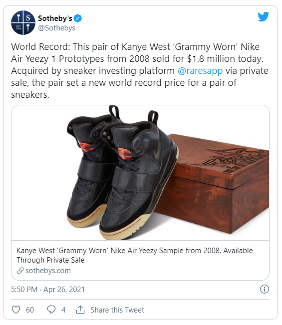 Nike Air Yeezy 1 более чем в 3 раза превзошли в цене предыдущие самые дорогие кроссовки. В мае 2020 года на аукционе в Нью-Йорке за 560 тыс. долларов были проданы Nike Air Jordan 1, в которых Майкл Джордан выступал за «Чикаго Буллз» на игре в 1985 году и разбил щит.