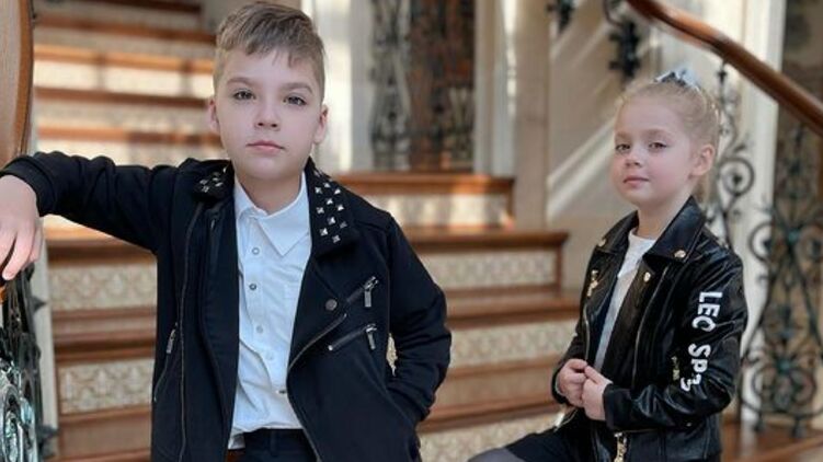 Однако помимо сдержанной школьной формы, на детях необычные рокерские куртки с заклёпками. Дети позируют на лестнице с деревянными перилами в семейном замке Пугачёвой и Галкина в подмосковной деревне Грязь.