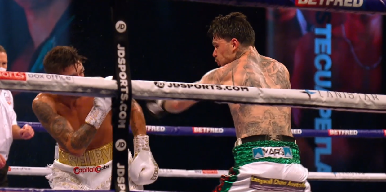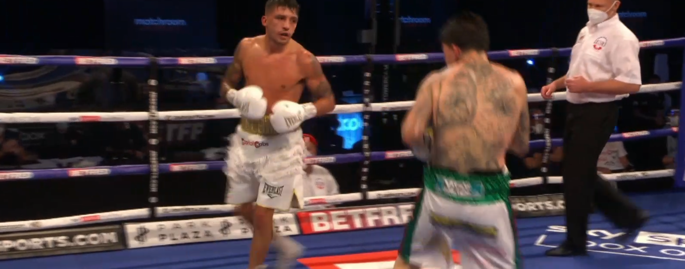 0:31 В целом пока визуальное преимущество у Джорджа Камбососа-младшего, но против него на ринге британский боксёр. А поединок проходит в Лондоне...