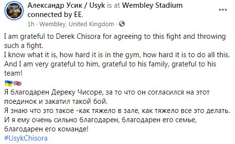 "Я благодарен Дереку Чисоре за то, что он согласился на этот поединок и закатил такой бой. Я знаю, что это такое - как тяжело в зале, как тяжело все это делать. И я ему очень сильно благодарен, благодарен его семье, благодарен его команде!", - написал украинский боксер.