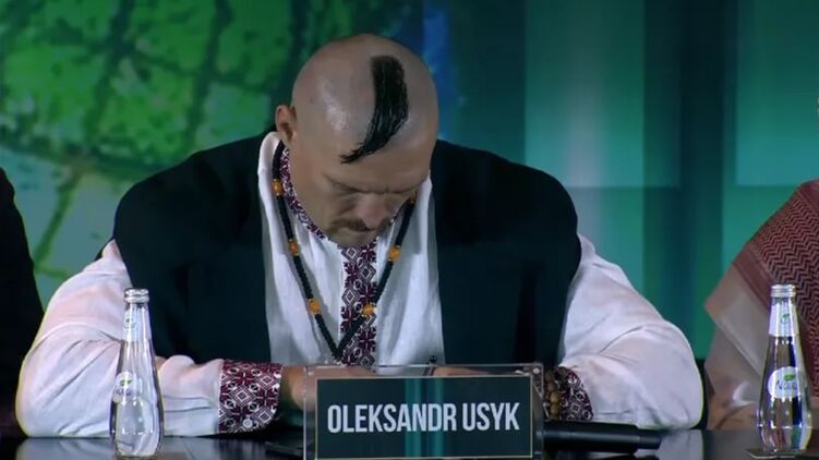 На пресс-конференции перед матчем-реваншем Усик был в образе казака. Фото: Twitter
