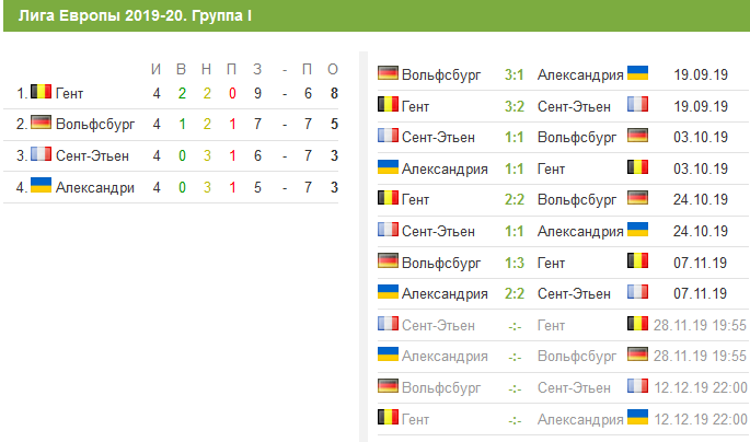 Турниная таблица в группе I Лиги Европы перед 5 туром