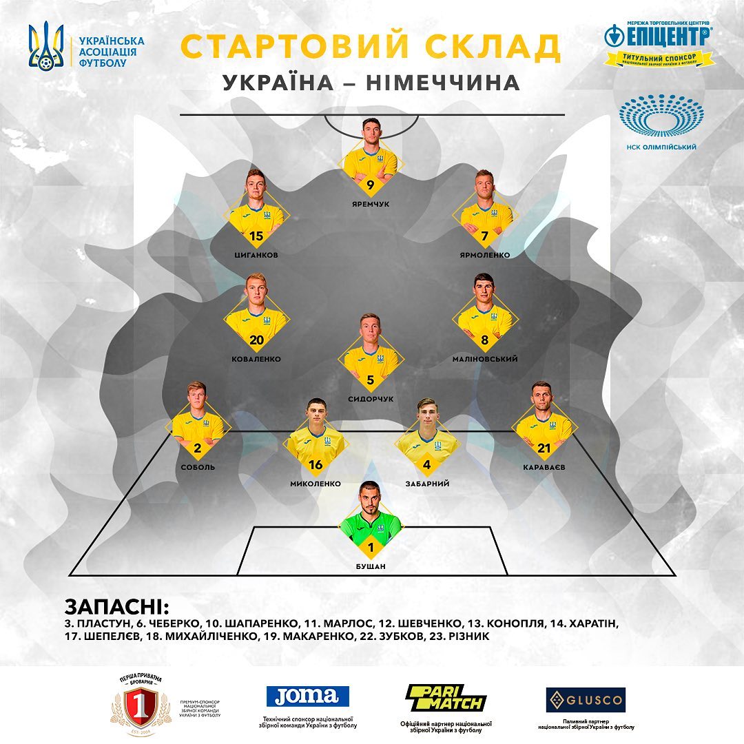 Украина: Бущан - защитники - Караваев, Забарный, Миколенко, Соболь - полузащитники - Малиновский, Сидорчук, Коваленко - нападающий Ярмоленко, Яремчук, Цыганков.