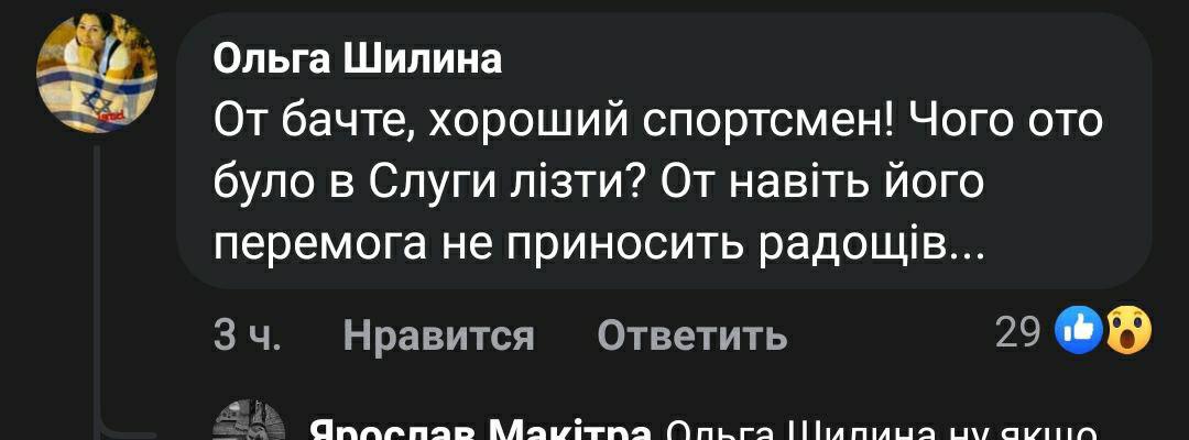 Еще один сторонник Порошенко начал спорить с ним. Он заявил, что у всех "слуг народа" "латентные промосковские взгляды". "Пока спортсмены будут в рядах слуг - я им радоваться не буду".