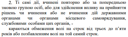 Ті ж дії, якщо вони, зокрема, робилися з метою вплинути на будь-які рішення держорганів чи органів місцевого самоврядування, вже караються позбавленням волі від 3 до 5 років.