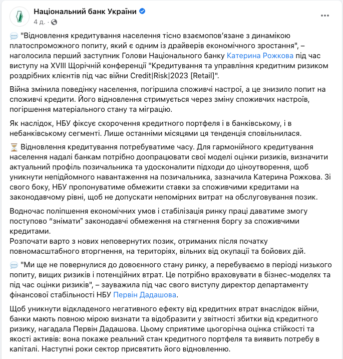 Про це йдеться в офіційному повідомленні регулятора з посиланням на першого заступника НБУ Катерину Рожкову.
