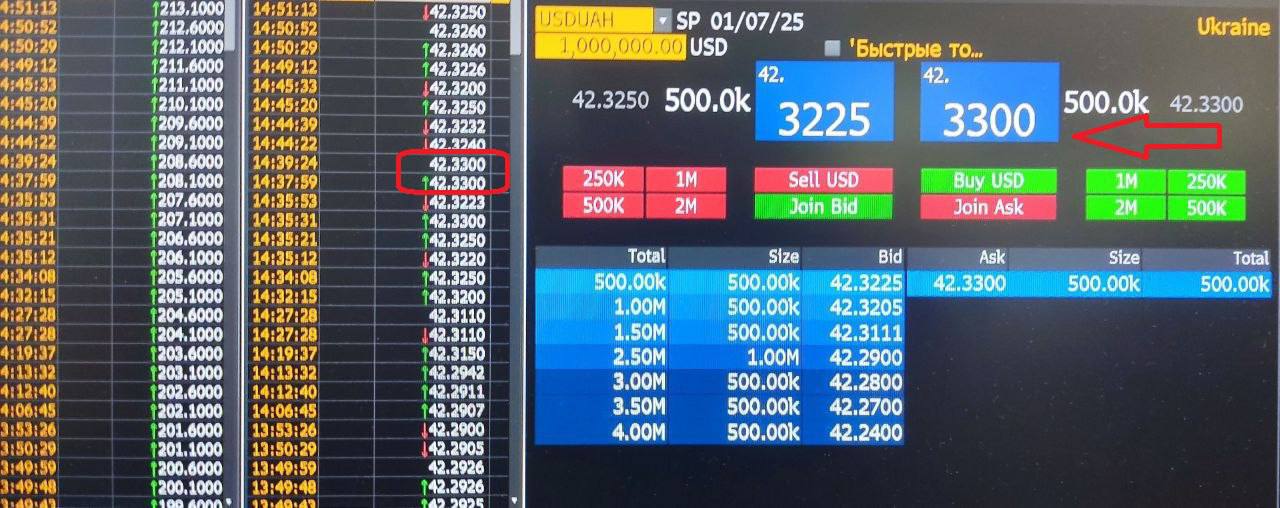 При цьому багато скарбників у ході торгів допускали встановлення і вищої ціни, оскільки котирування міжбанку піднімалися вище. Відкриття торгів на майданчику Bloomberg сьогодні відбулося на рівні 42,2 грн/$, вже за годину долар продавали вже по 42,255 грн/$і ще до обіду ринок піднявся до 42,3080 грн/$, подолавши черговий психологічний етап. На цьому девальвація гривні не зупинилась. Після обіду реальна ціна міжбанківських угод сягала 42,33 грн/$, і лише під закриття (останні 20 хвилин) відбулася корекція до 42,24 грн/$.