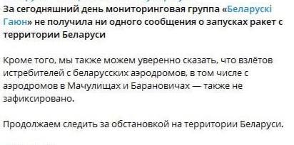 Білоруські моніторингові групи повідомляють, що запусків ракет з території Білорусі сьогодні не зафіксовано, як і зльоту винищувачів.