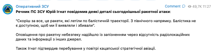 "Повідомлення про ракетну небезпеку надійшло із запізненням через відсутність радіолокаційних даних та інформації з інших джерел. На жаль, у Збройних Силах України немає ефективних засобів виявлення та знищення балістичних ракет", - заявив Ігнат.