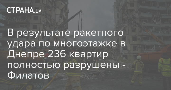 Мер Дніпра Борис Філатов заявив, що внаслідок ракетної атаки по житловому будинку в місті, яка забрала життя вже 40 людей, 236 квартир повністю зруйновані.