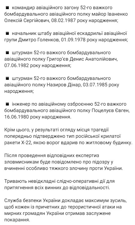 Крім того, СБУ заявила, що "в результаті огляду місця трагедії попередньо підтверджено тип російської крилатої ракети Х-22, якою ворог вдарив по житловому будинку".