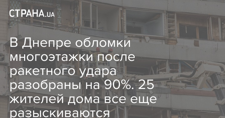 Станом на ранок вівторка, 17 січня, уламки зруйнованої російською ракетою багатоповерхівки у Дніпрі розібрано на 90%. Рятувальна операція триває вже понад 63 години.