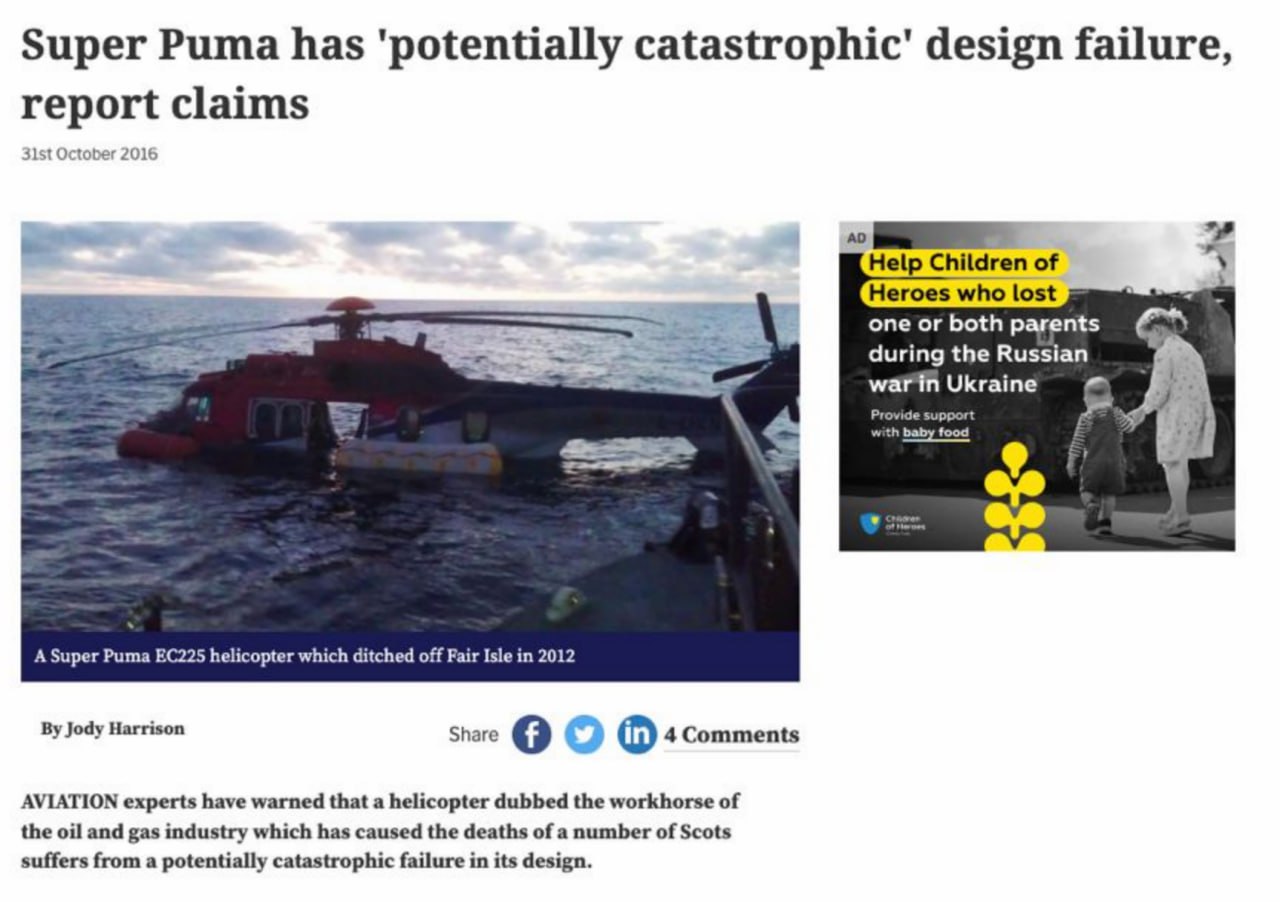 У звіті стверджувалося, що в коробці передач вертольота Super Puma було виявлено серйозну проблему, пов'язану з пошкодженням підшипників. Вона ж називається ймовірною причиною аварії цього вертольота у 2016 році, коли загинули 12 людей, і потенційно ще шість інших випадків, починаючи з 1980 року.