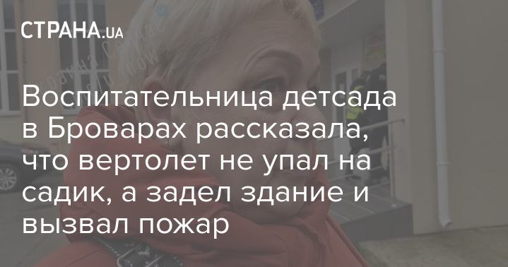 Вихователька дитячого садка у Броварах Антоніна Петрівна розповіла, що вертоліт не впав на дитсадок, а лише зачепив будинок садка, викликавши пожежу.