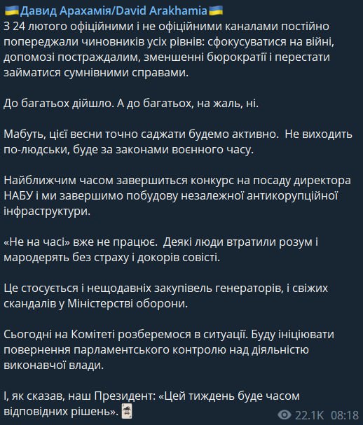 "Це стосується і нещодавніх закупівель генераторів, і свіжих скандалів у Міноборнах", - заявив Арахамія.