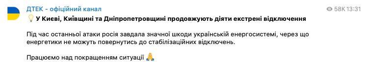 Поки що енергетики не можуть повернутися до планових графіків через значну шкоду енергетиці після сьогоднішньої ракетної атаки.