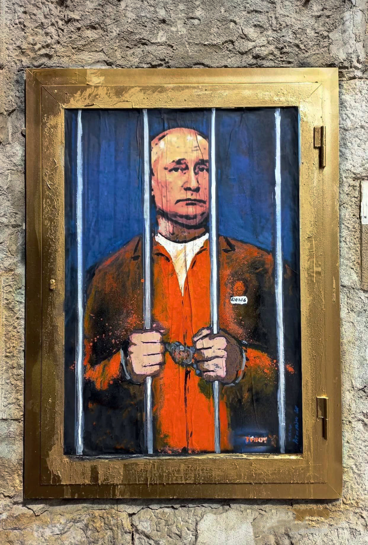 Однією з найвідоміших робіт TvBoy є мурал із Путіним за ґратами в помаранчевій робі із наручниками на руках. Він розташований у Барселоні на площі Sant Jaume біля мерії.