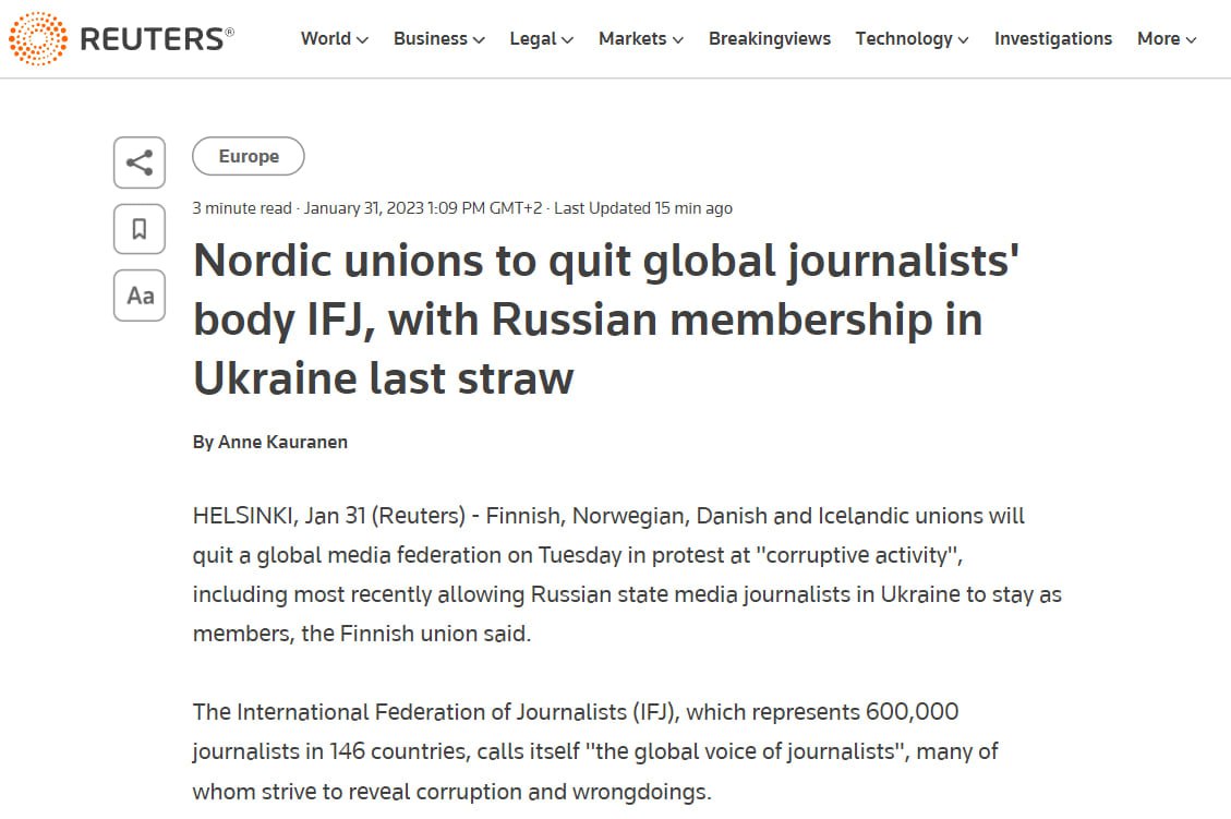 13.35 У Міжнародному союзі журналістів скандал - профспілки північних країн залишають організацію на знак протесту проти "корупційної діяльності", суть якого - недавній дозвіл журналістам російських державних ЗМІ, присутнім в Україні, залишатися членами фінської профспілки журналістів, пише Reuters.