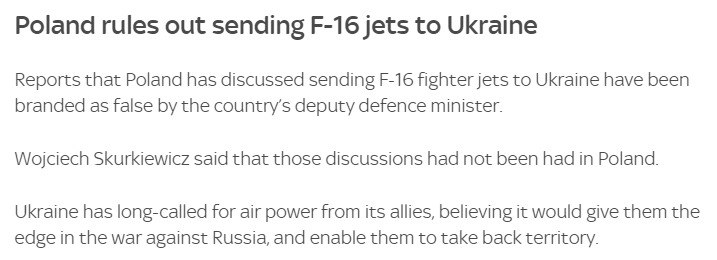 У повідомленні йдеться про те, що раніше публікована інформація про обговорення Польщею відправки винищувачів F-16 в Україну була неправдивою.