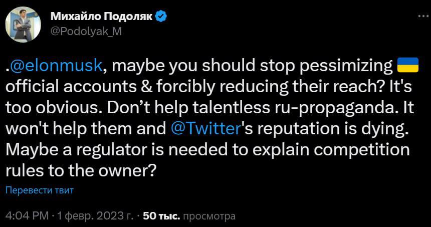"Ілон Маск, може вистачити песимізувати офіційні акаунти України та насильно скорочувати охоплення? Занадто все очевидно... Не треба допомагати безталанній російській пропаганді. Їм це не допоможе, а репутація Twitter вмирає. Може, потрібен регулятор, який пояснить власнику правила конкуренції?", - написав він.