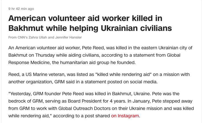 11.01 У Бахмуті загинув 33-річний американський волонтер Піт Рід.