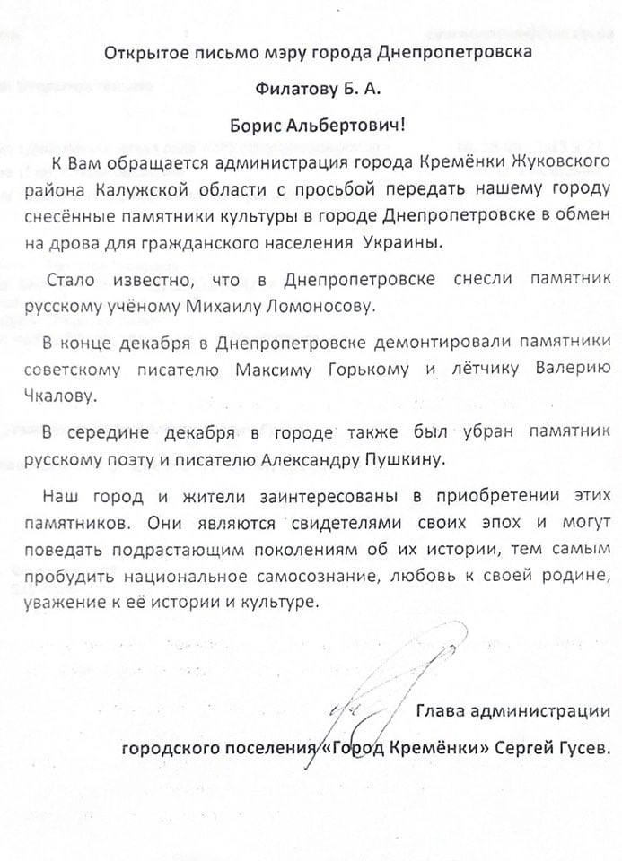 У листі йдеться про пам'ятники Ломоносову, Горькому, Чкалову та Пушкіну, які в Кременках хочуть поставити у себе в місті. Натомість жителям Дніпра (точніше – Дніпропетровська, як він називається у листі) пропонуються дрова (щоправда, не уточнюється кількість).