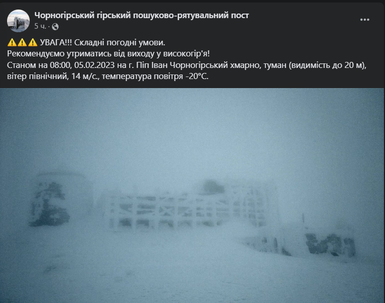 "Увага! Складні погодні умови. Рекомендуємо утриматися від виходу у високогір'я", - попереджають рятувальники.