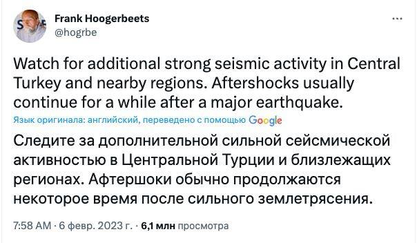 "Рано чи пізно у цьому регіоні (Південно-Центральна Туреччина, Йорданія, Сирія, Ліван) з'явиться землетрус магнітудою 7,5", - написав він минулого тижня у Твіттері.