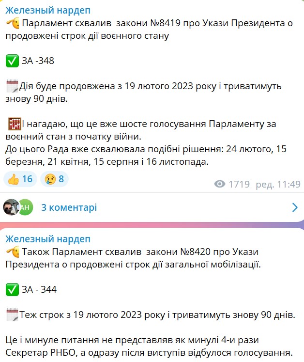 У вівторок, 7 лютого, Верховна Рада продовжила термін дії військового стану та загальної мобілізації на 90 днів – з 19 лютого 2023 року.