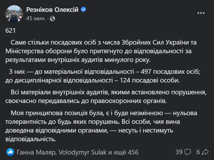 Рєзніков заявив про сотні покараних до ЗСУ та Міноборони за підсумками аудиту. Під постом запитали: "Де посадки?"