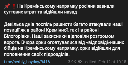 Російські війська кілька днів активно вели атаки у напрямку Кремінної. Проте армія РФ зазнала суттєвих втрат і відійшла.