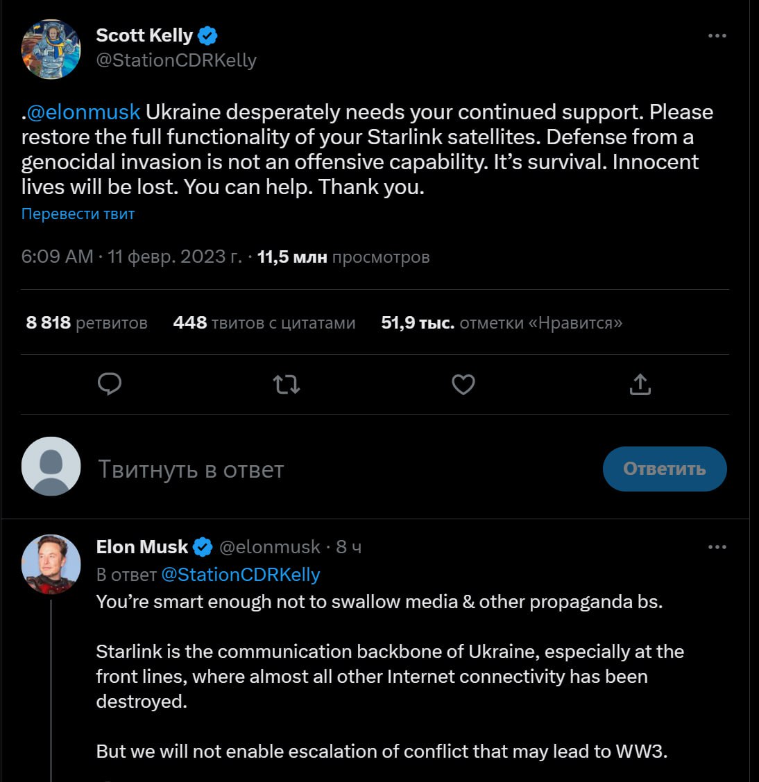 07:40 Американський астронавт Скотт Келлі закликав Ілона Маска повернути Україні повний доступ до інтернету від "Старлінк". Маск відповів, що не допустить Третьої світової війни.
