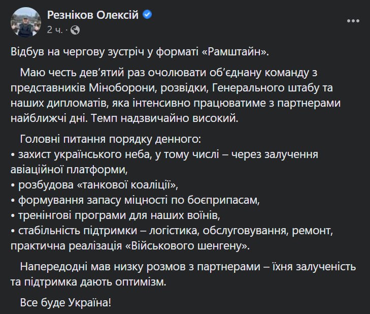 "Маю честь вдев'яте очолювати об'єднану команду з представників Міноборони, розвідки, Генерального штабу та наших дипломатів, яка інтенсивно працюватиме з партнерами найближчими днями. Темп дуже високий", - написав Резніков у Facebook.