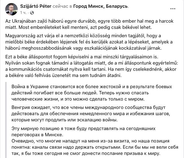"Угорщина очікує, що всі члени міжнародної спільноти діятимуть для забезпечення негайного миру та уникнення кроків, які можуть продовжити або посилити війну. Цю мирну позицію я теж представлятиму на сьогоднішніх переговорах у Мінську", - пише міністр.