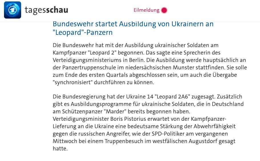 14:27 У Німеччині розпочалося навчання українських військових управлінню танками Leopard 2, повідомляє Міноборони ФРН.