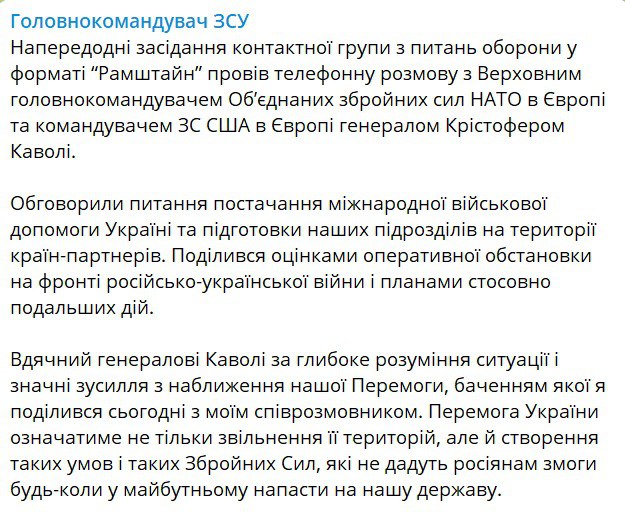 20:30 Напередодні засідання контактної групи "Рамштайн" головком ЗСУ Валерій Залужний поспілкувався телефоном із командувачем Об'єднаних збройних сил НАТО в Європі та командувачем ЗС США у Європі генералом Крістофером Каволі.