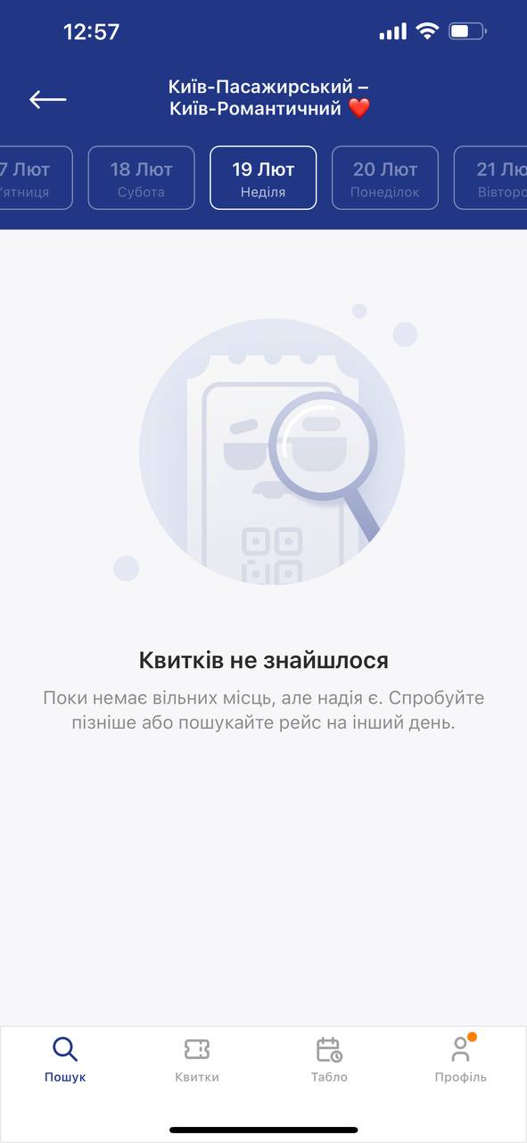 Проте на даний момент у мобільному додатку "Укрзалізниця" доступних квитків немає.