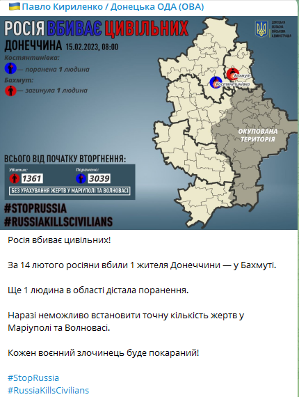 "За 14 лютого росіяни вбили 1 жителя Донбасу – у Костянтинівці. Ще 1 людина в області отримала поранення", – написав Кириленко.