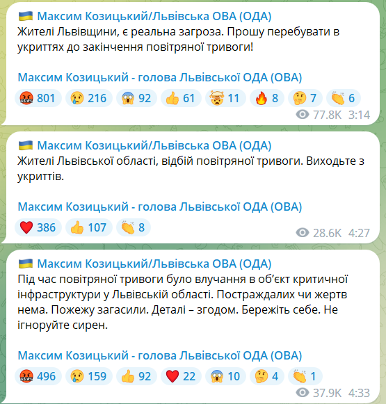 "Під час повітряної тривоги було потрапляння в об'єкт критичної інфраструктури у Львівській області. Постраждалих або жертв немає. Пожежа була згашена. Деталі – пізніше. Бережіть себе. Не ігноруйте сирен", - написав він.