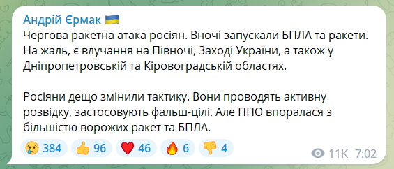 Глава Офісу президента Андрій Єрмак повідомив, що вночі росіяни запускали по Україні безпілотники та ракети. В результаті зафіксовано попадання у кількох регіонах України.